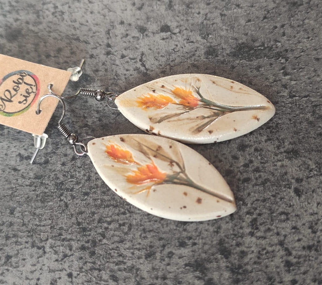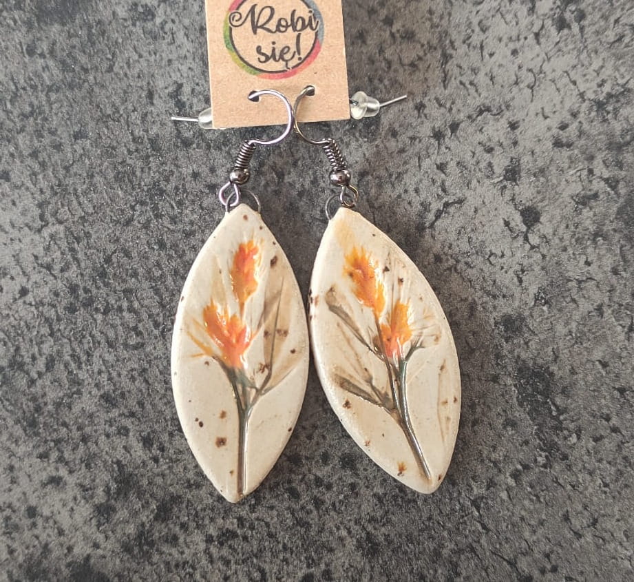 Unikalne ręcznie robione kolczyki ceramiczne z odciskiem roślin