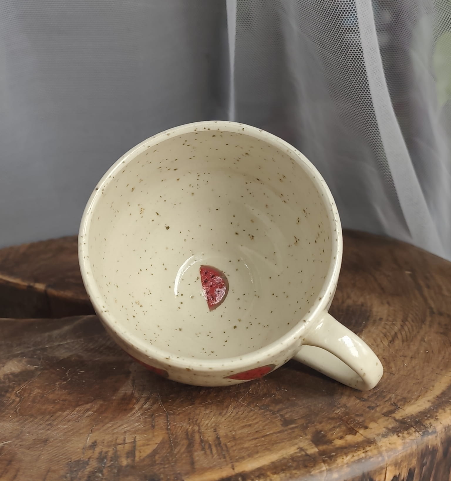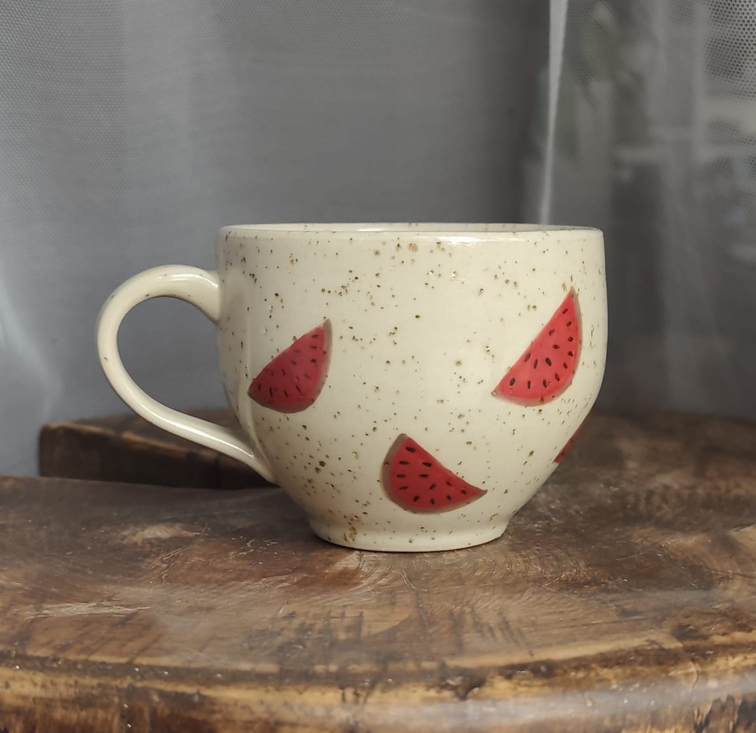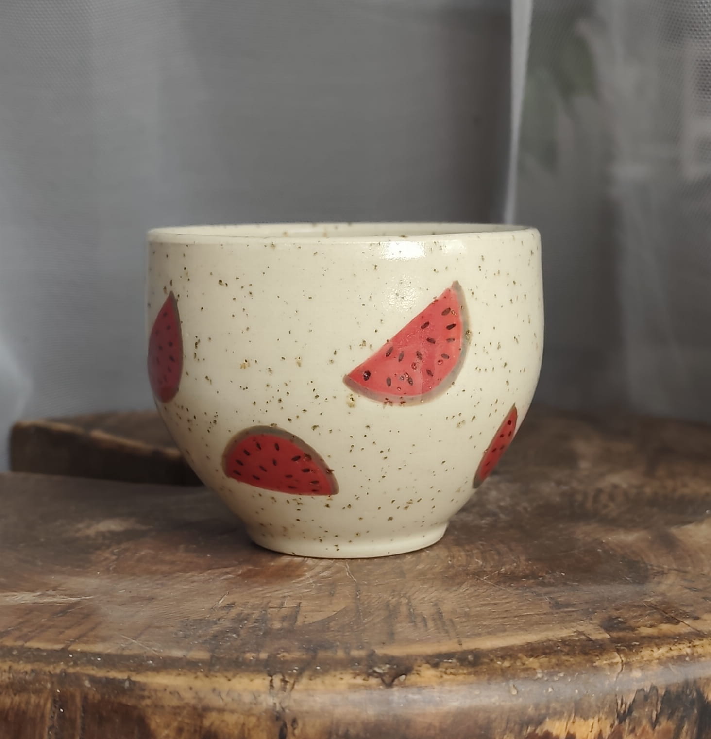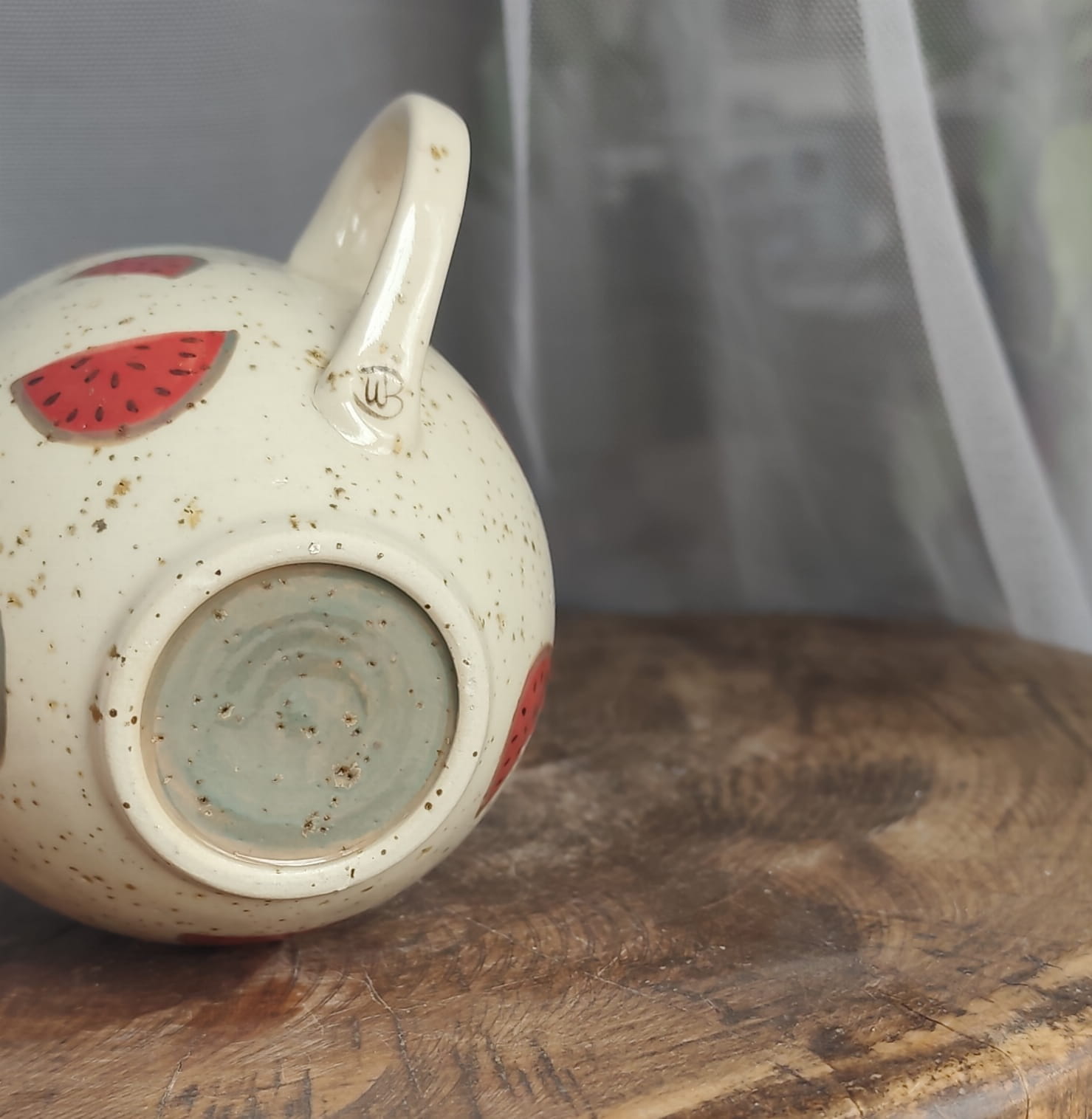Unikalny kubek toczony na kole z malowany w arbuzy.