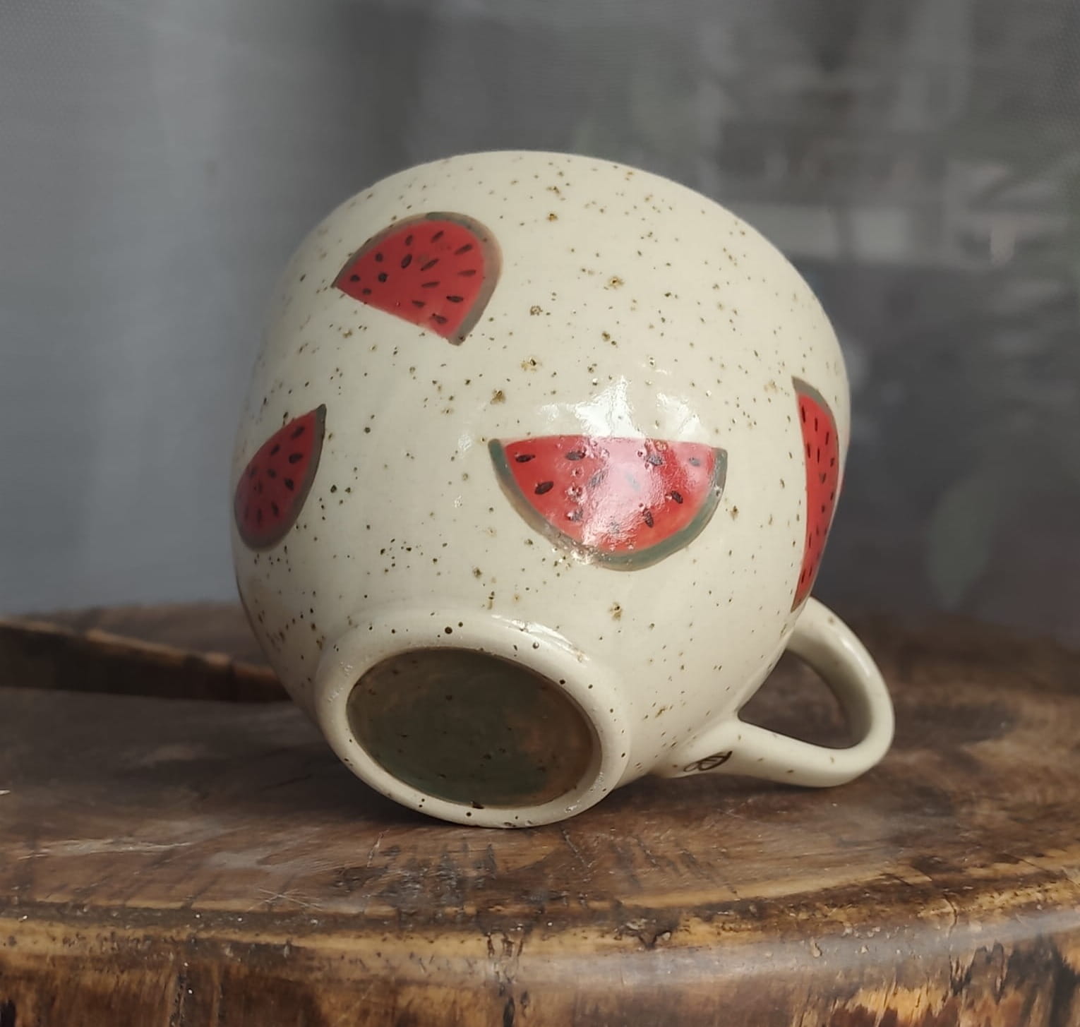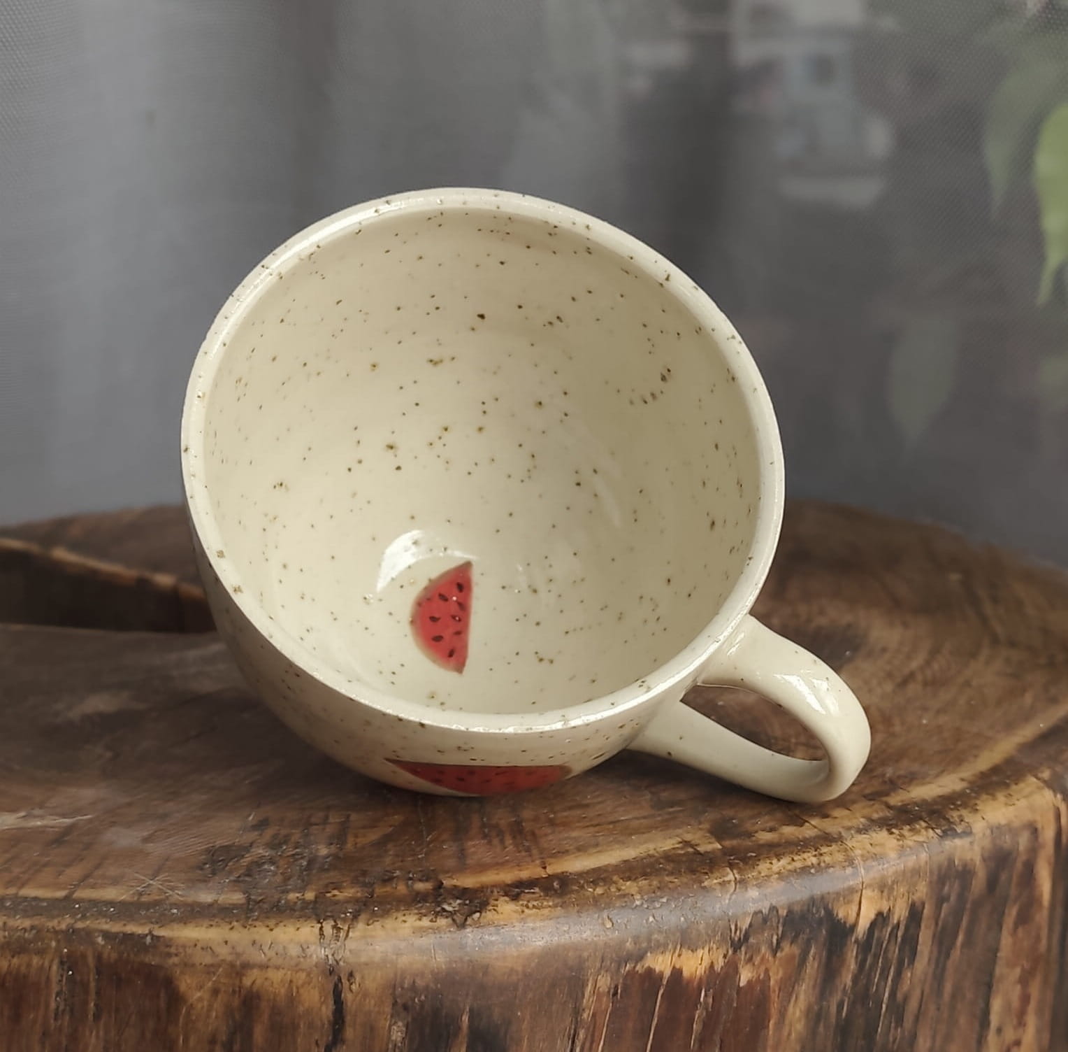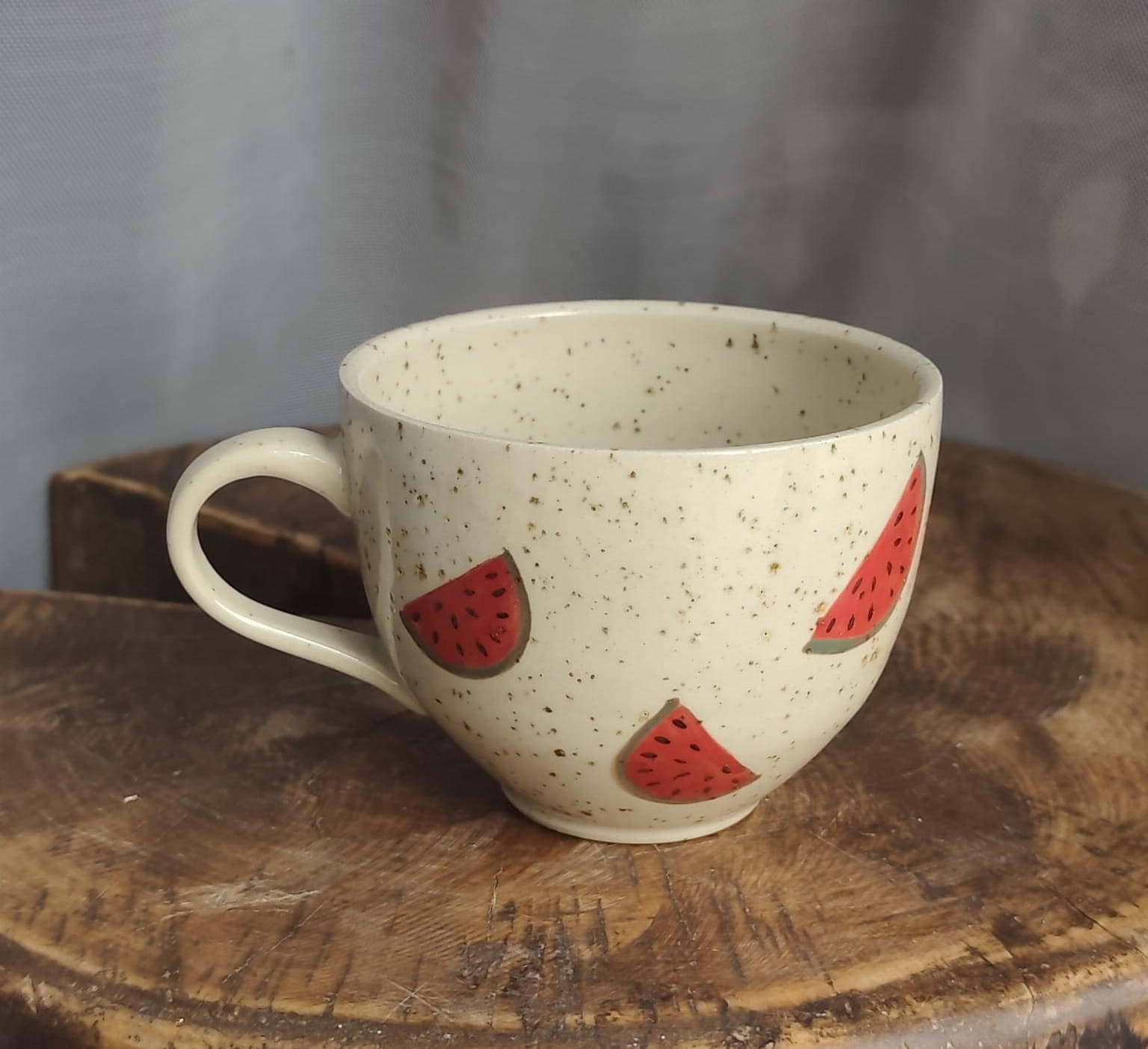 Unikalny kubek toczony na kole z malowany w arbuzy.