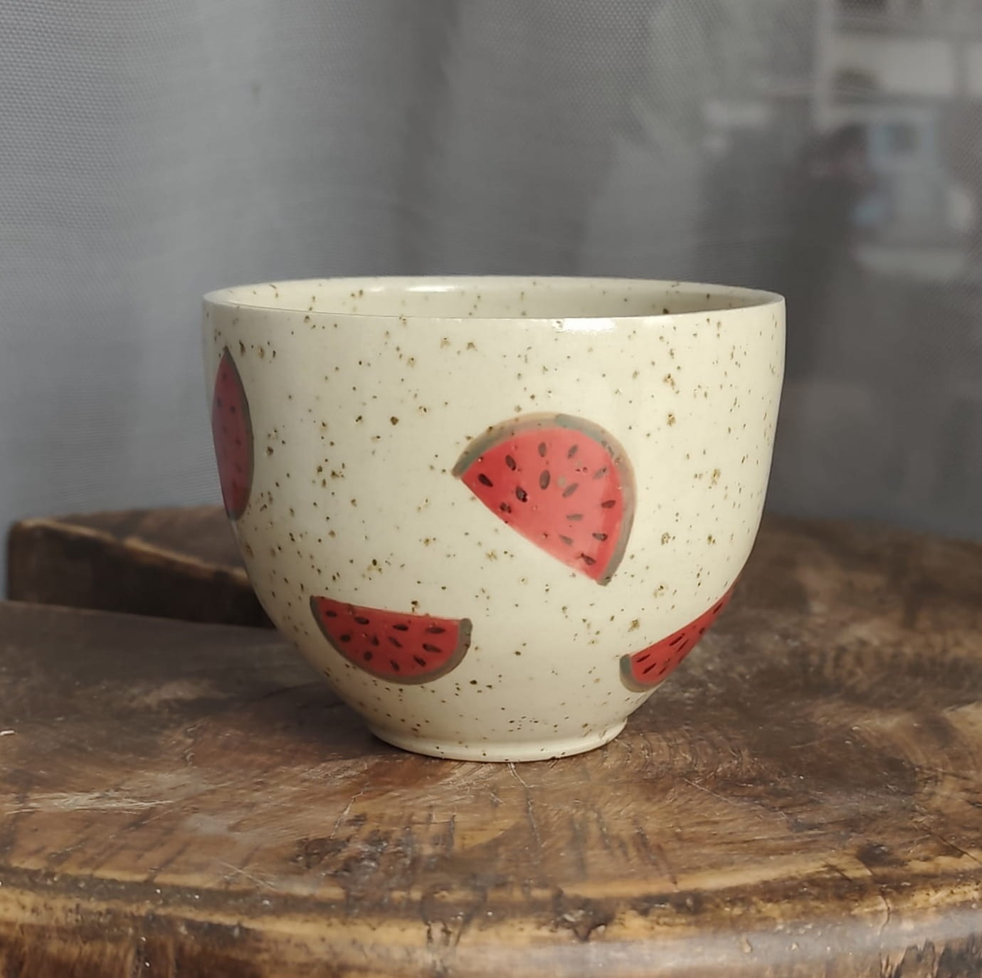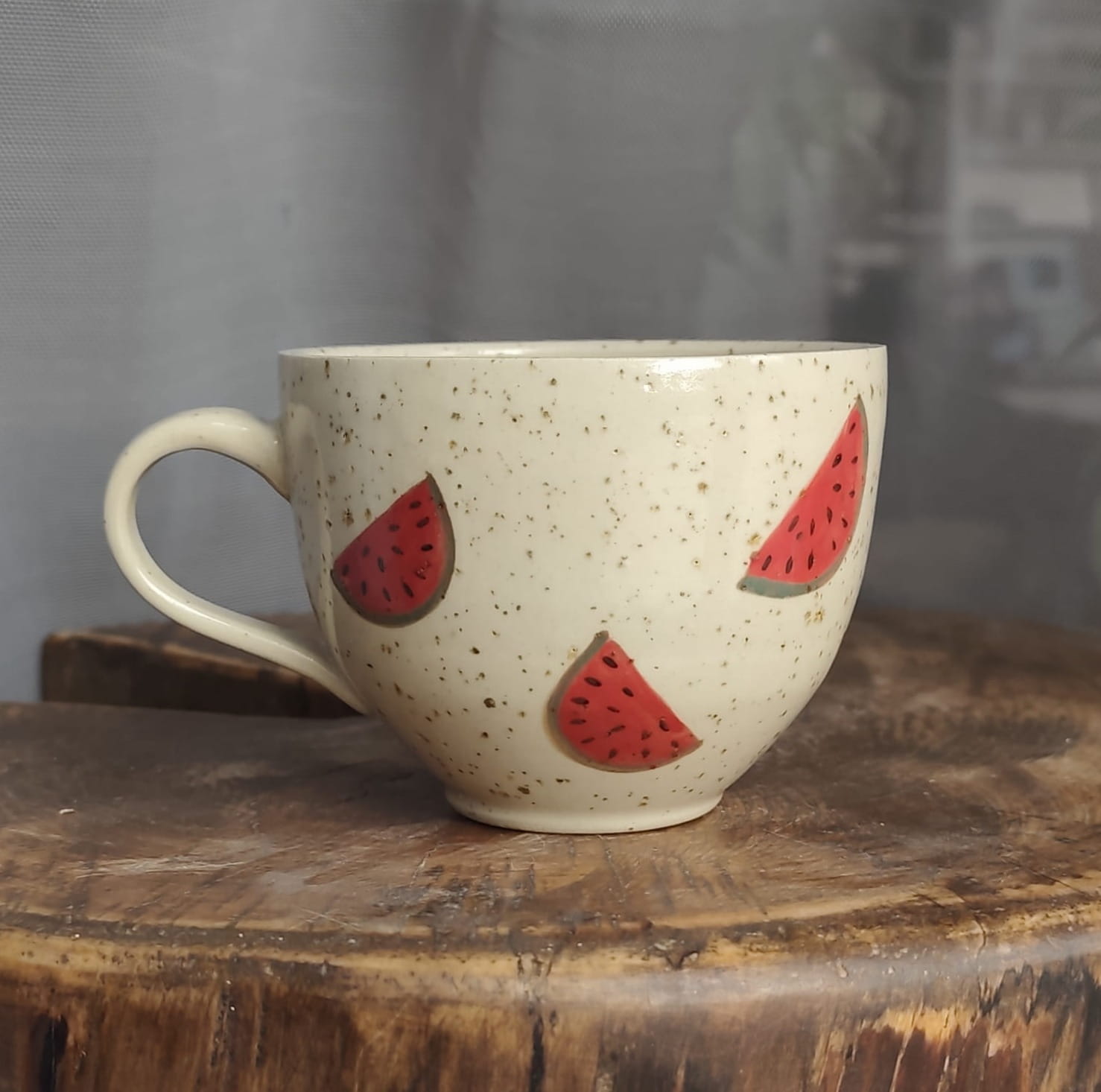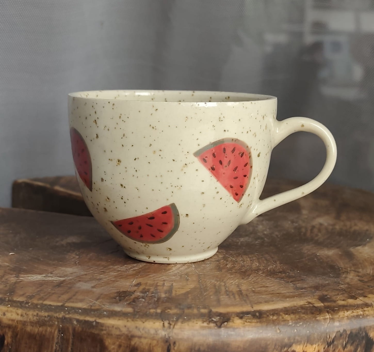 Unikalny kubek toczony na kole z malowany w arbuzy.