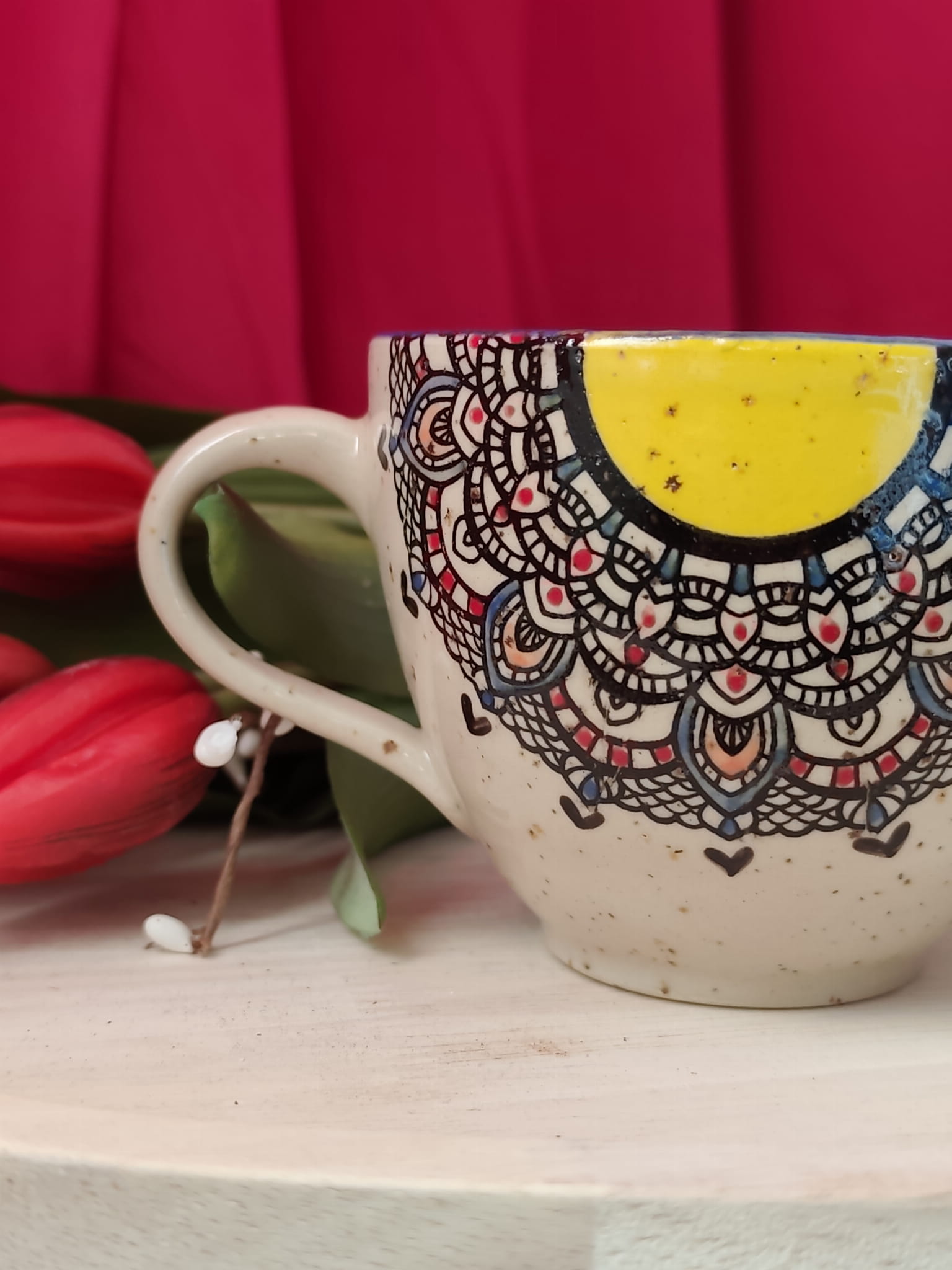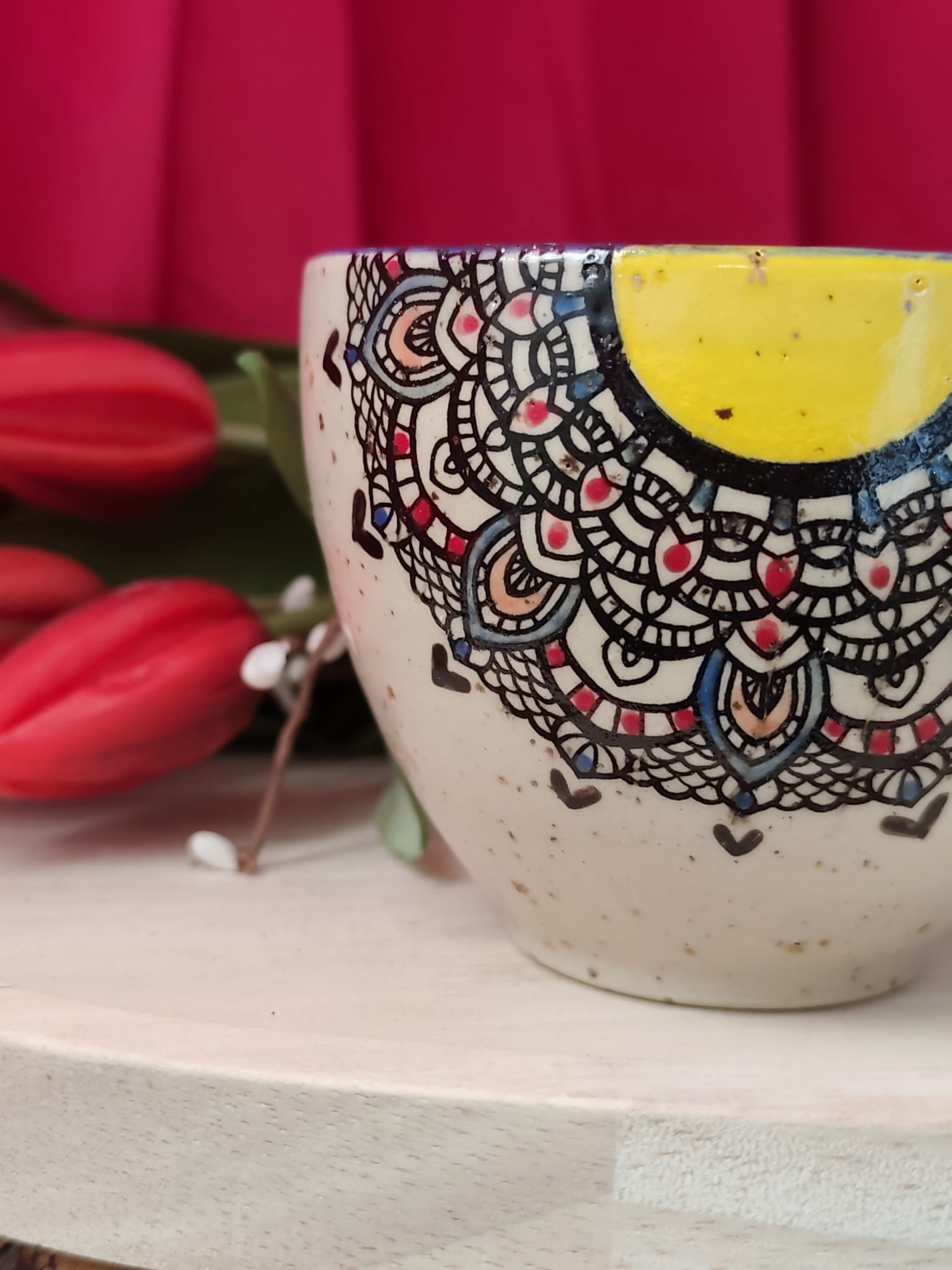 - Ręcznie lepiony – ten kubeczek jest toczony na kole, dzięki czemu ma bardziej regularny kształt. Pamiętaj jednak o tym, że każdy tworzę ręcznie, osobno, mogą się różnić między sobą kształtem czy pojemnością, różnice są niewielkie, ale są, podobnie jeśli chodzi o malowany wzór.
