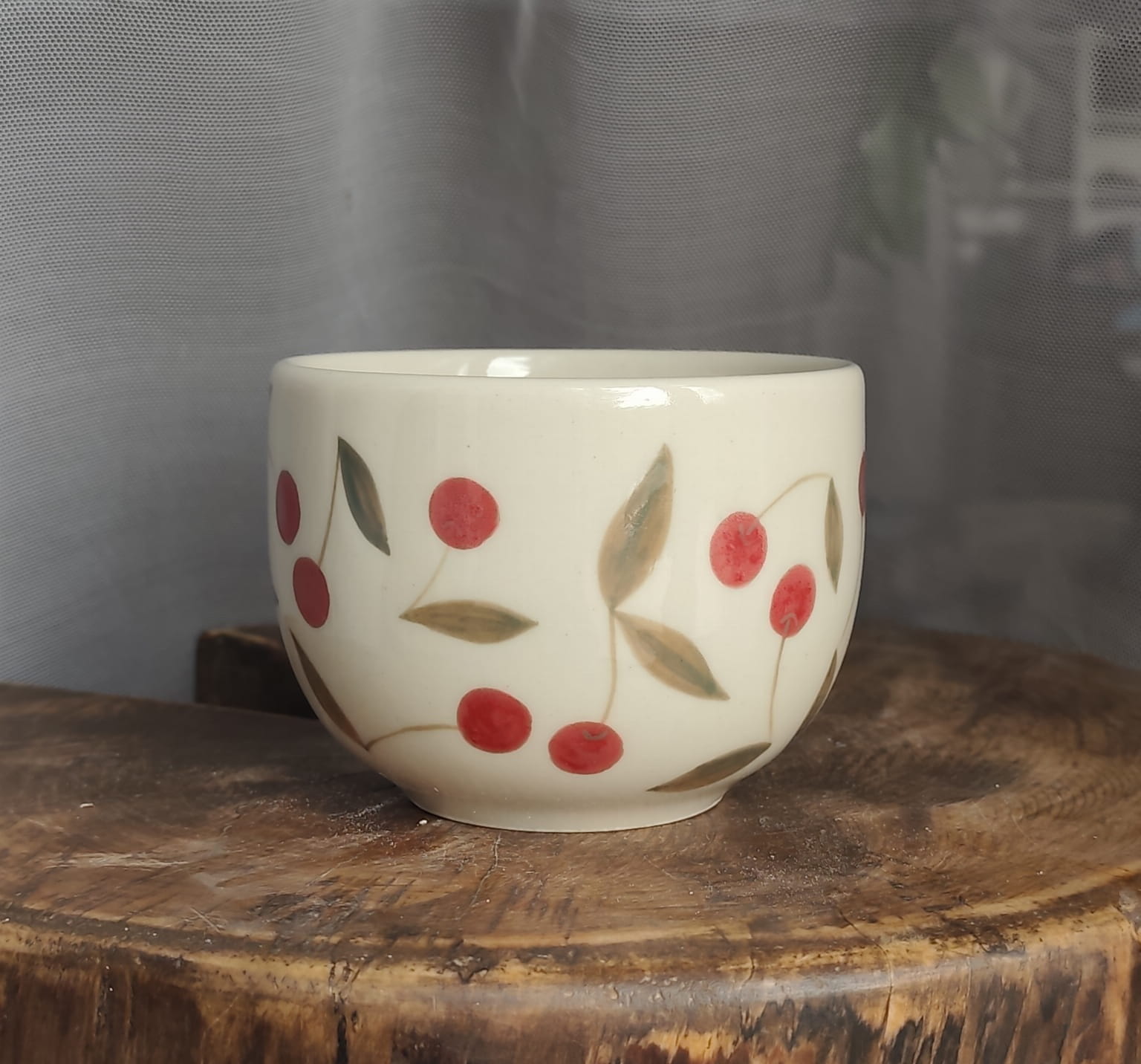 - Ręcznie wykonany – ten kubeczek było odlewany w formie z gliny w formie lejnej, dzięki czemu ma bardziej regularny kształt. Pamiętaj jednak o tym, że każdy tworzę ręcznie, osobno, mogą się różnić między sobą kształtem czy pojemnością, różnice są niewielkie, ale są, podobnie jeśli chodzi o malowany wzór.