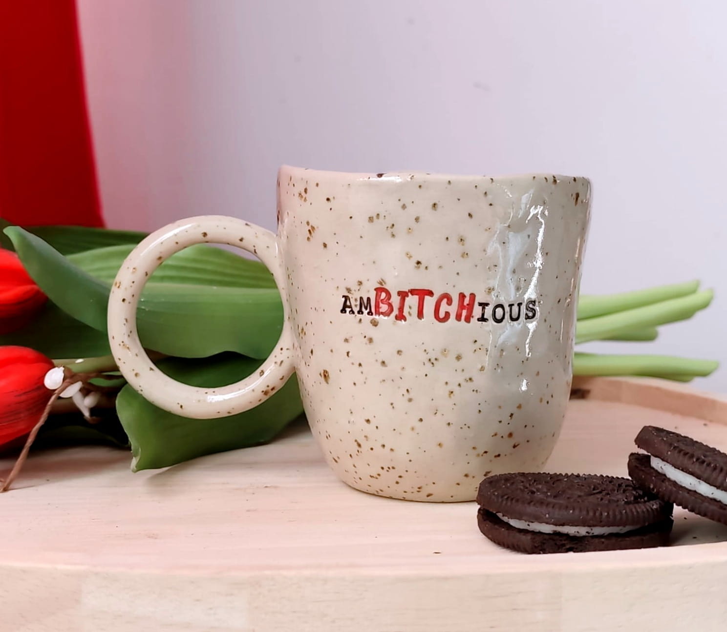 Kubek z napisem : AmBITCHious, lepiony ręcznie ok 200 ml 14/03