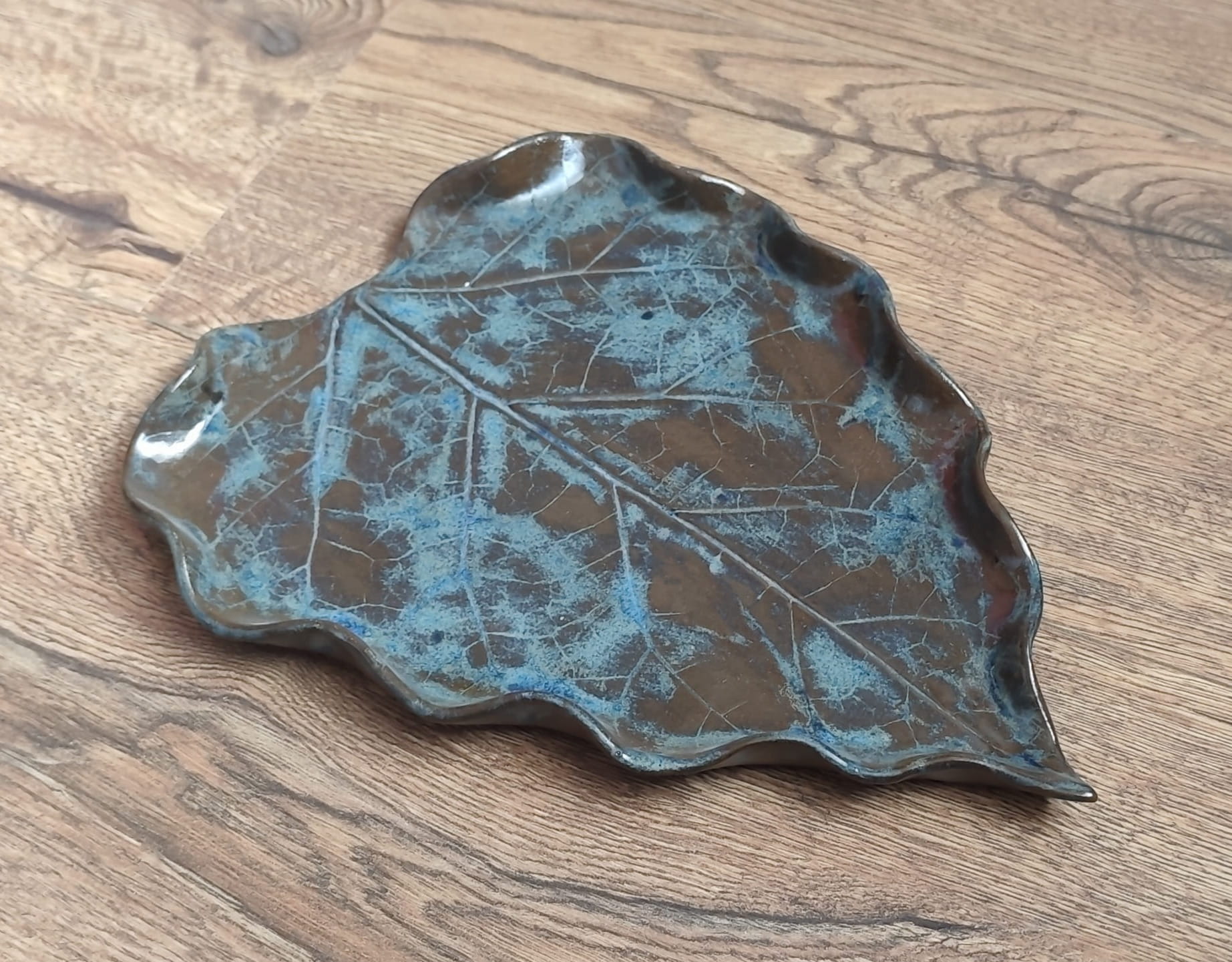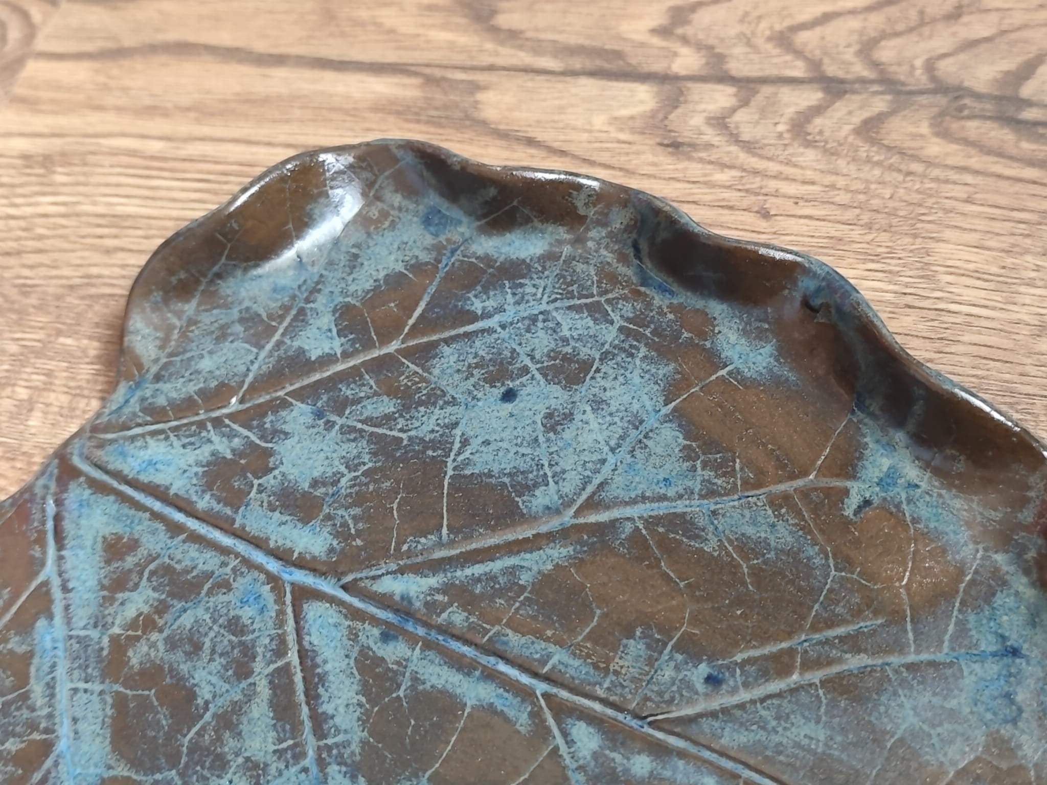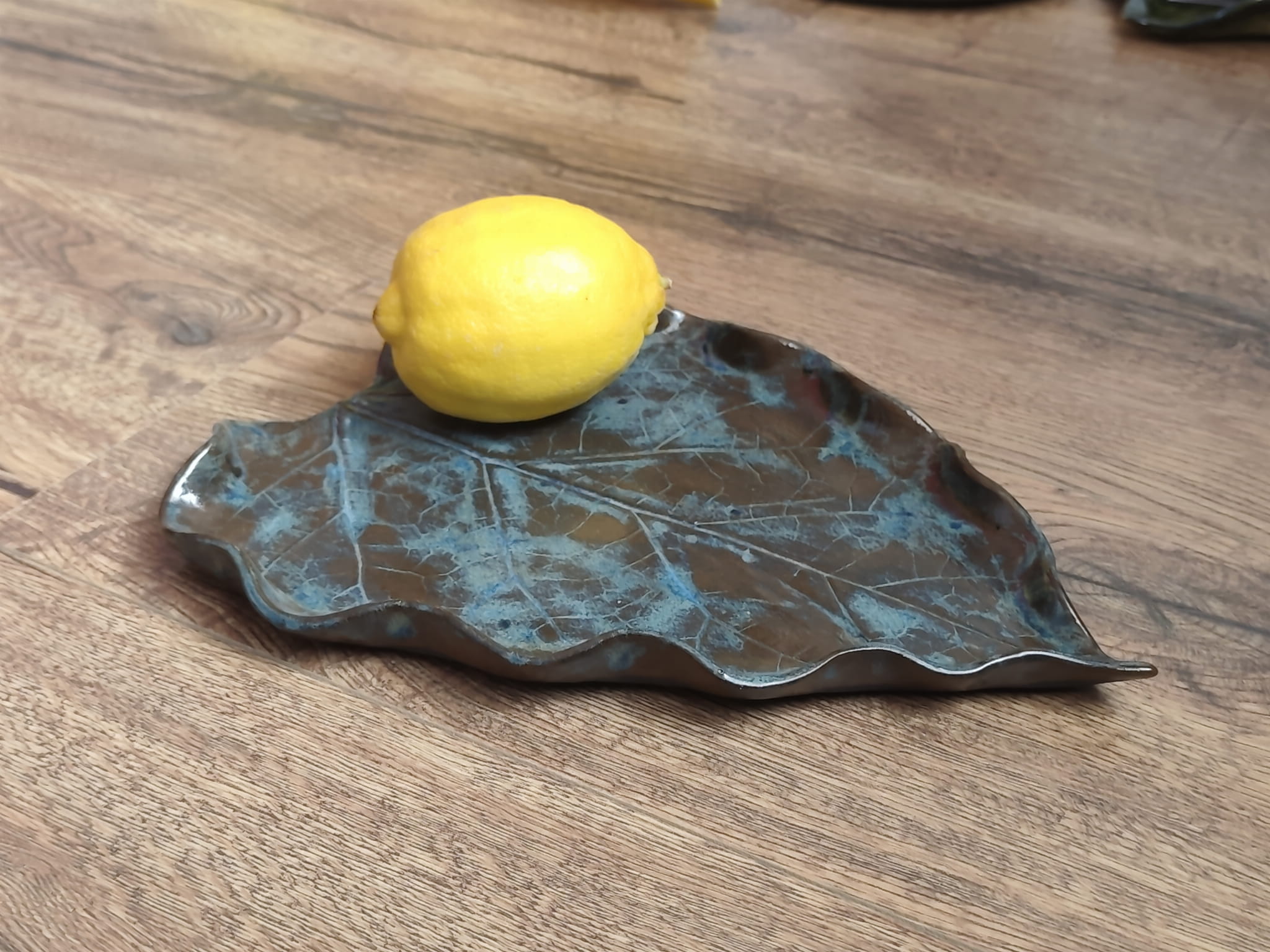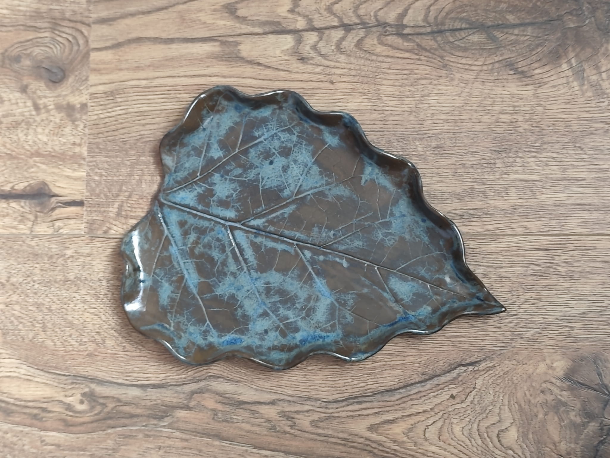 Każdy egzemplarz jest unikatowy, ponieważ powstaje w oparciu o żywy liść. Patera do użytku spożywczego lub dekoracyjnego, można ją myć w zmywarce.