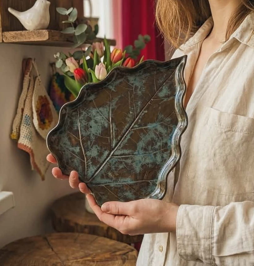 Ręcznie wykonana patera ceramiczna inspirowana naturą – odwzorowuje kształt prawdziwego liścia, zachowując jego delikatne nerwy i organiczną formę. Utrzymana w subtelnych tonach szarości i błękitu, wprowadza do wnętrza spokój i elegancki, naturalny akcent.