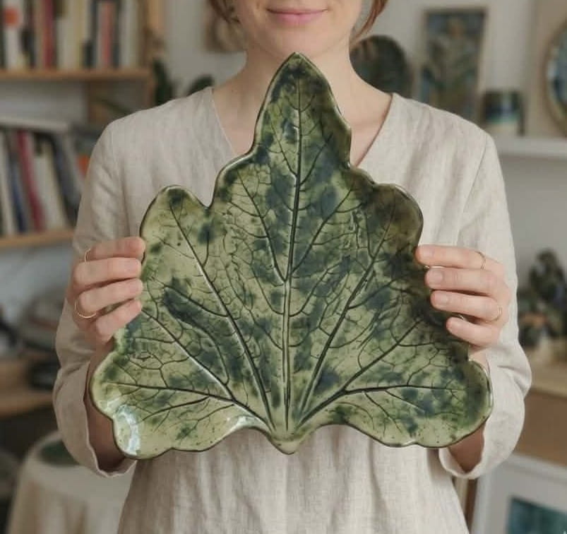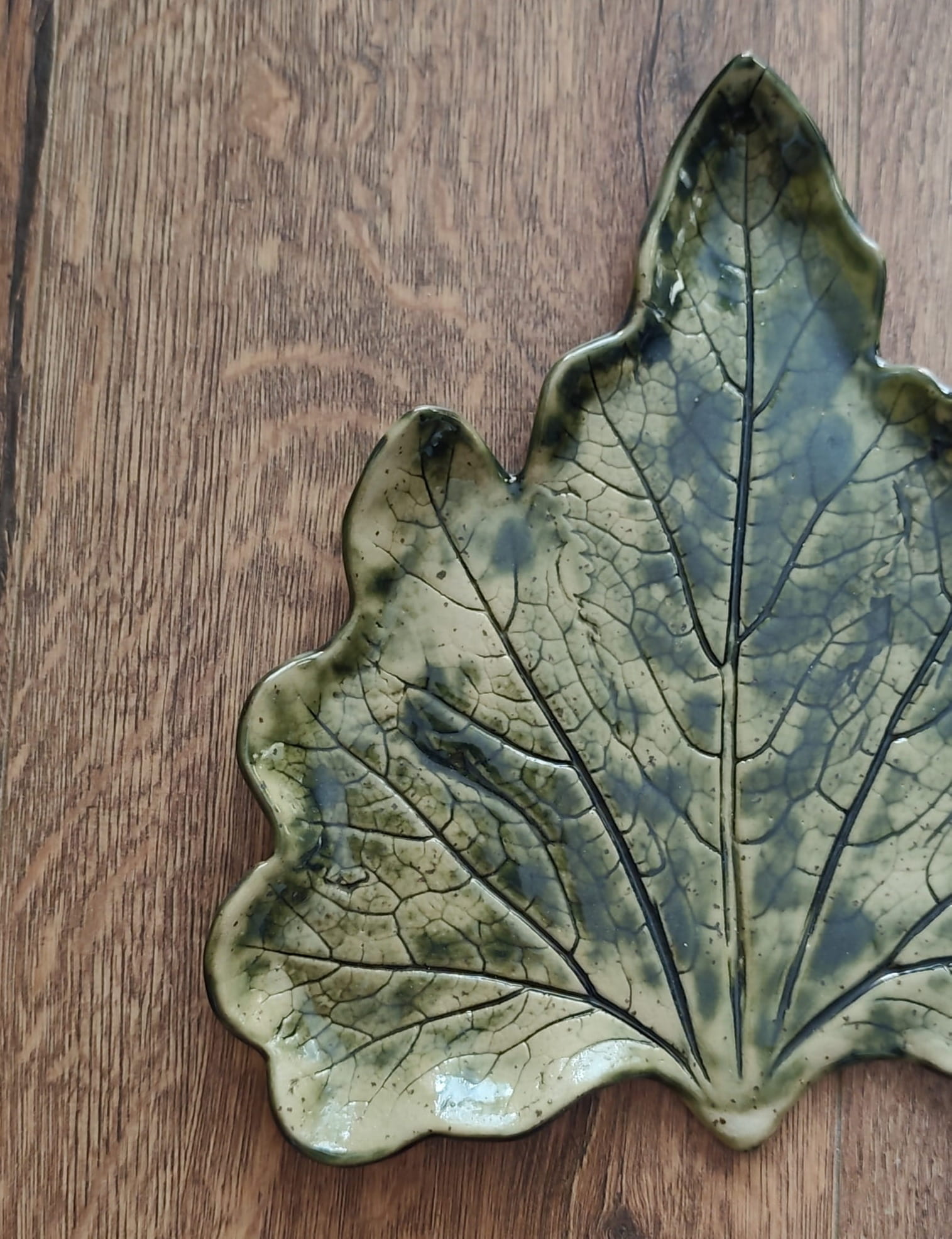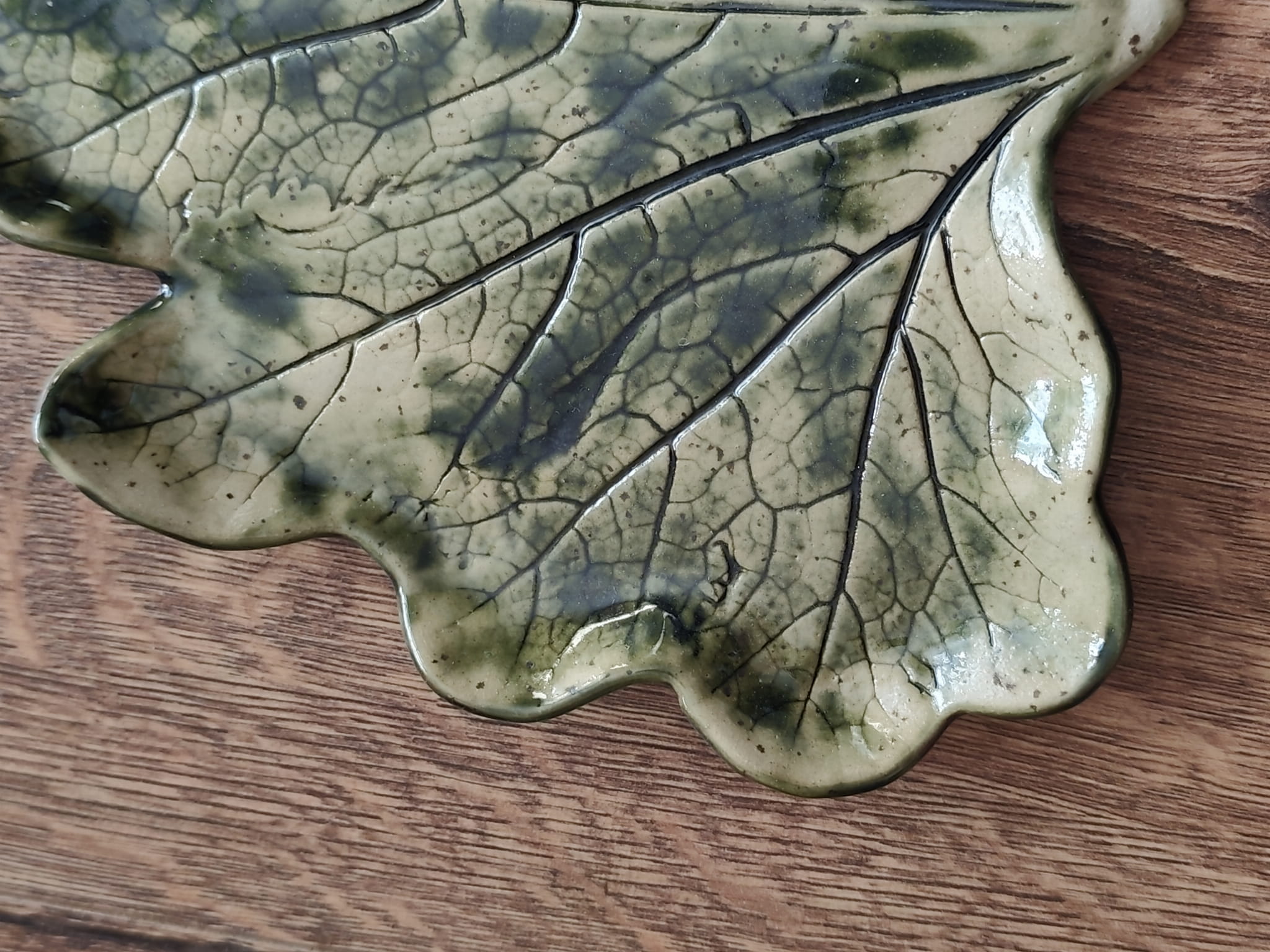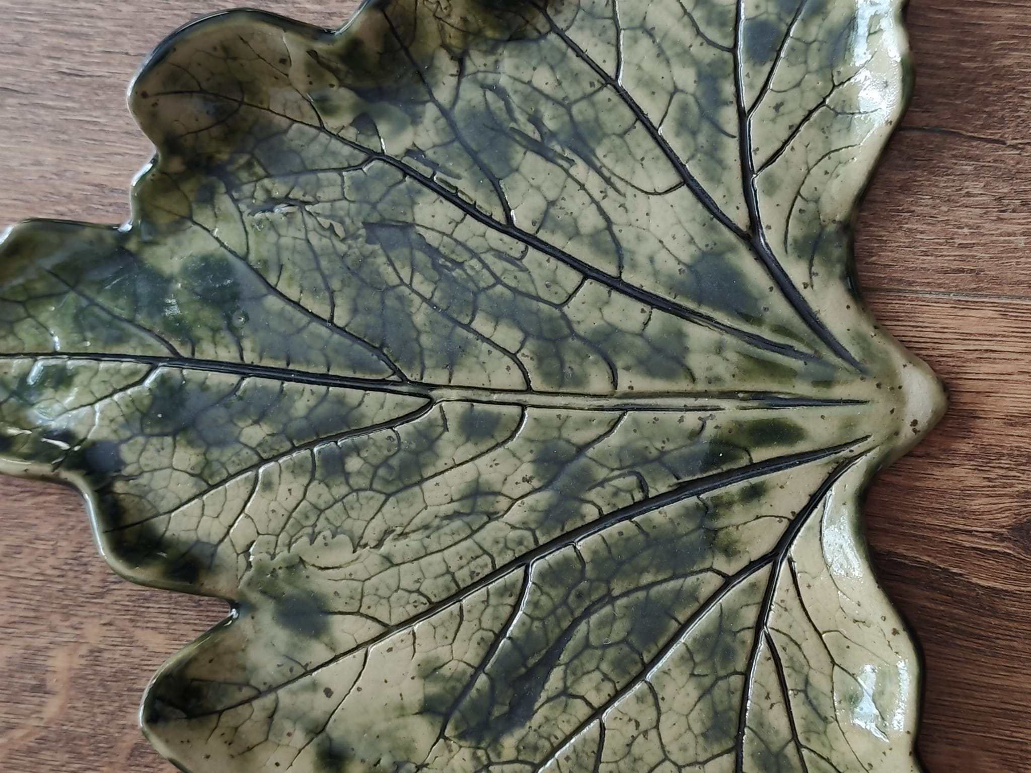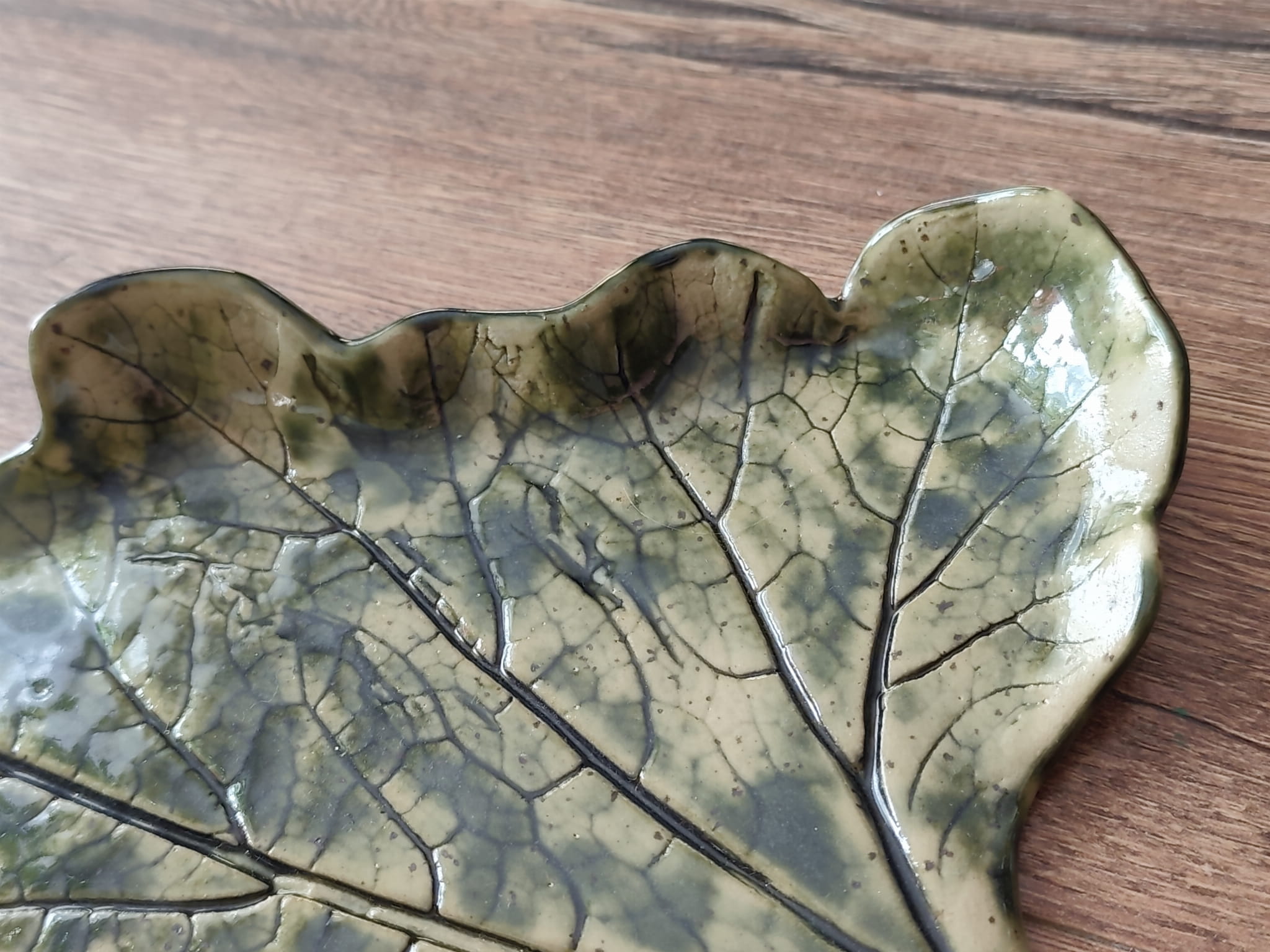 Każdy egzemplarz jest unikatowy, ponieważ powstaje w oparciu o żywy liść. Patera do użytku spożywczego lub dekoracyjnego, można ją myć w zmywarce.