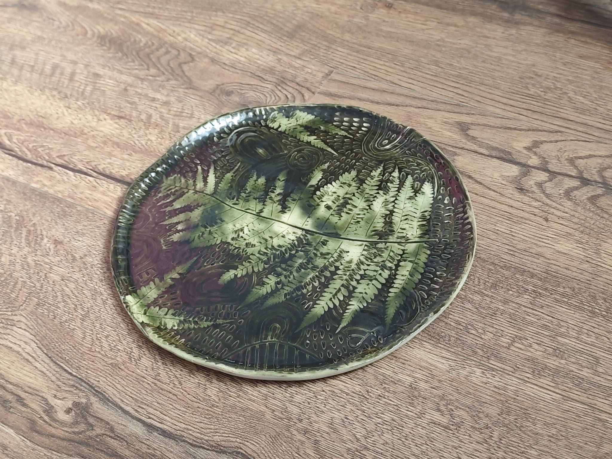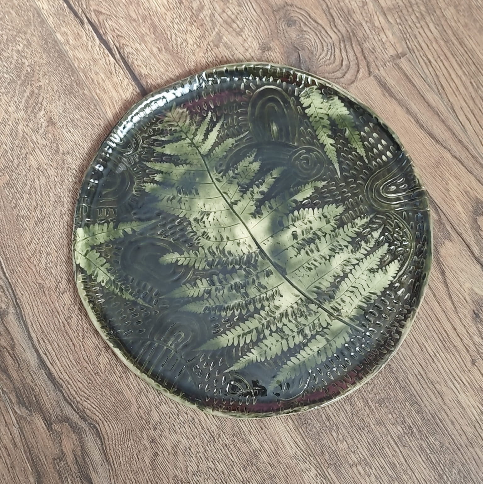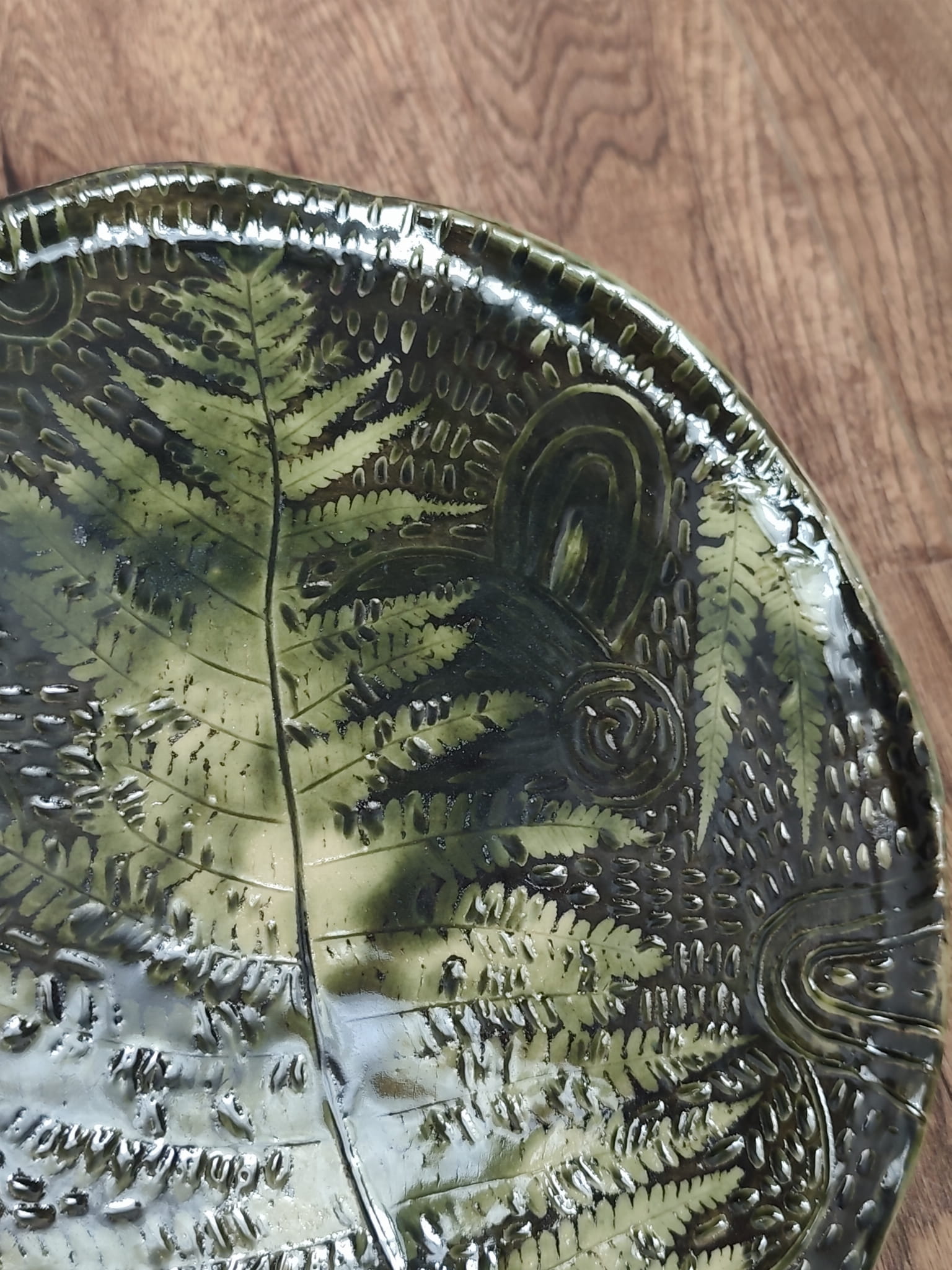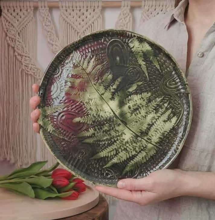 Ręcznie wykonana patera ceramiczna inspirowana naturą – okrągła o średnicy ok 23 cm. Lepiona ręcznie. Dekorowana z wykorzystaniem żywych liści paproci w połączeniu z techniką sgraffito.