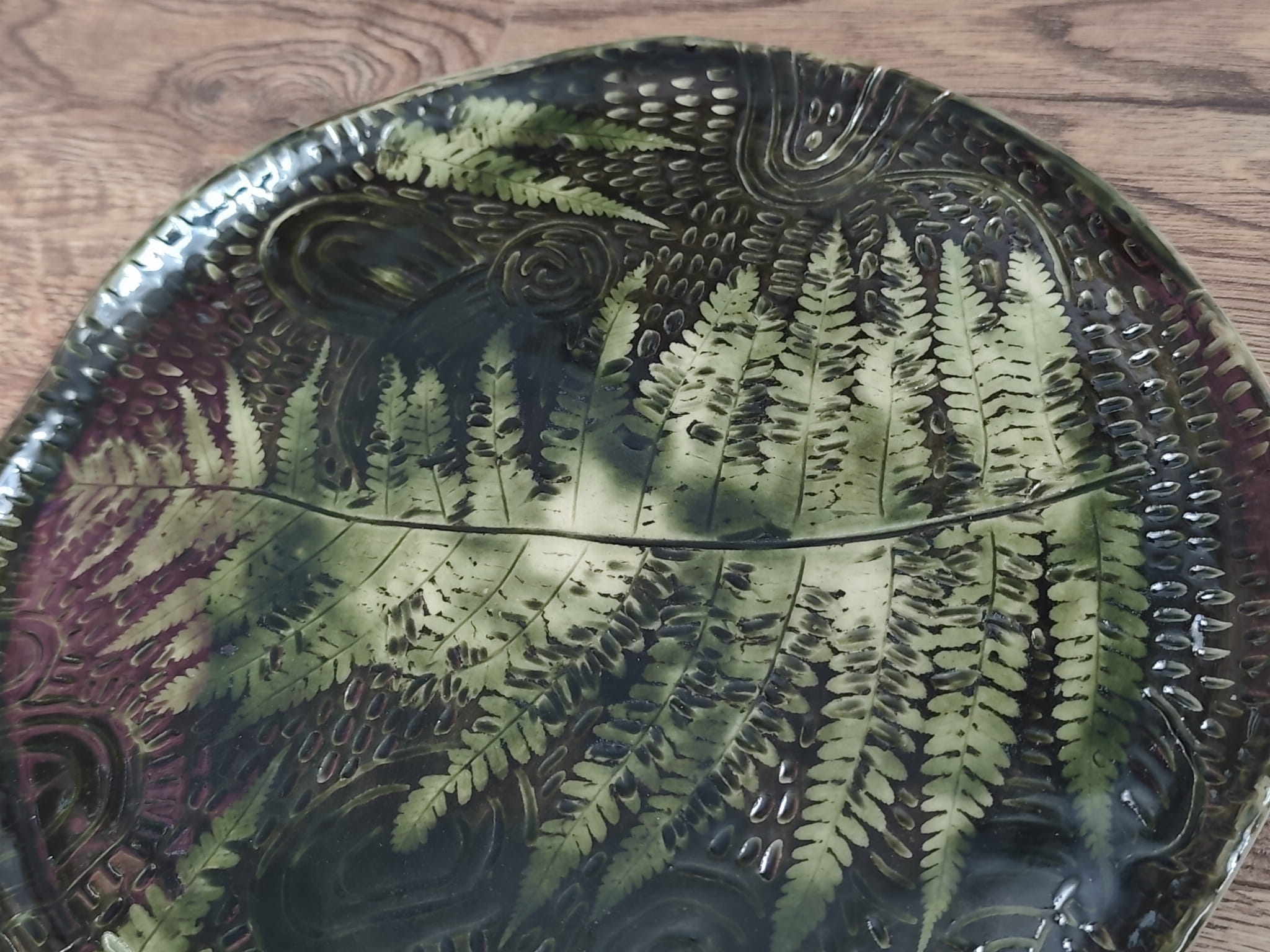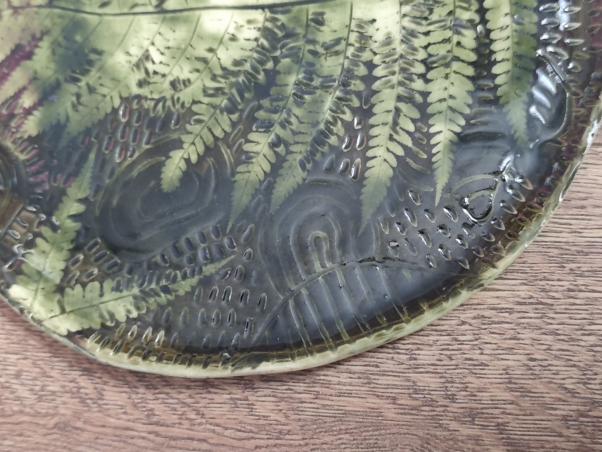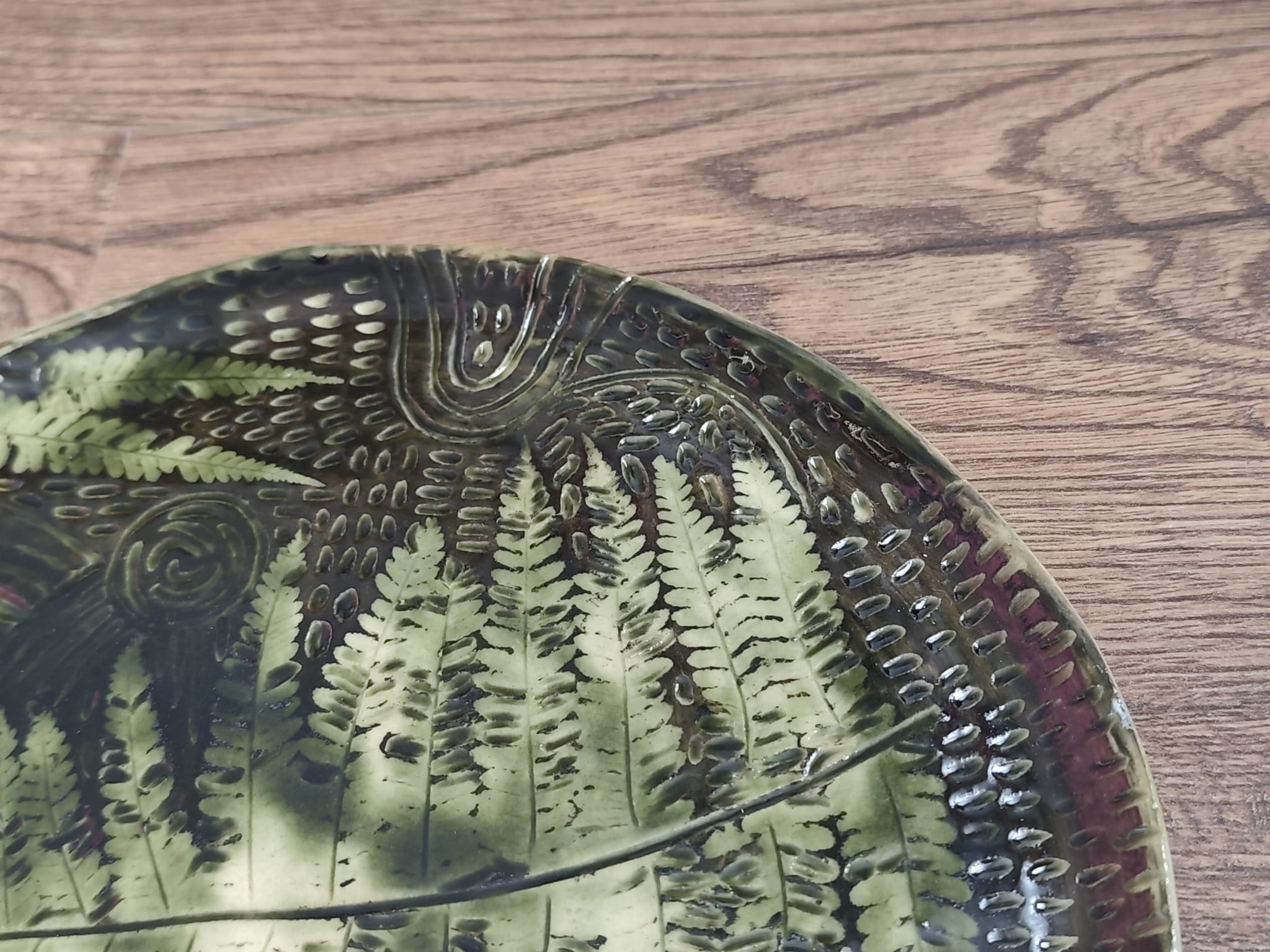 Ręcznie wykonana patera ceramiczna inspirowana naturą – okrągła o średnicy ok 23 cm. Lepiona ręcznie. Dekorowana z wykorzystaniem żywych liści paproci w połączeniu z techniką sgraffito.