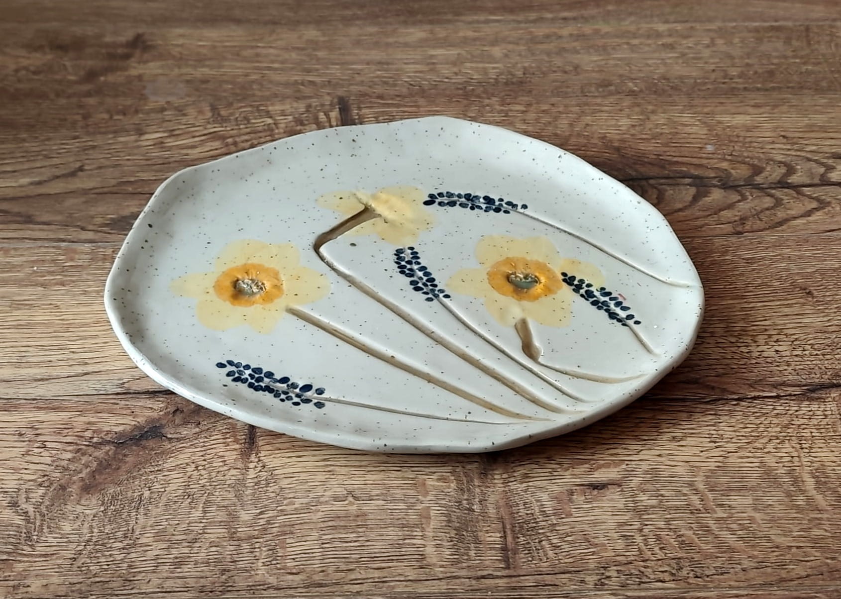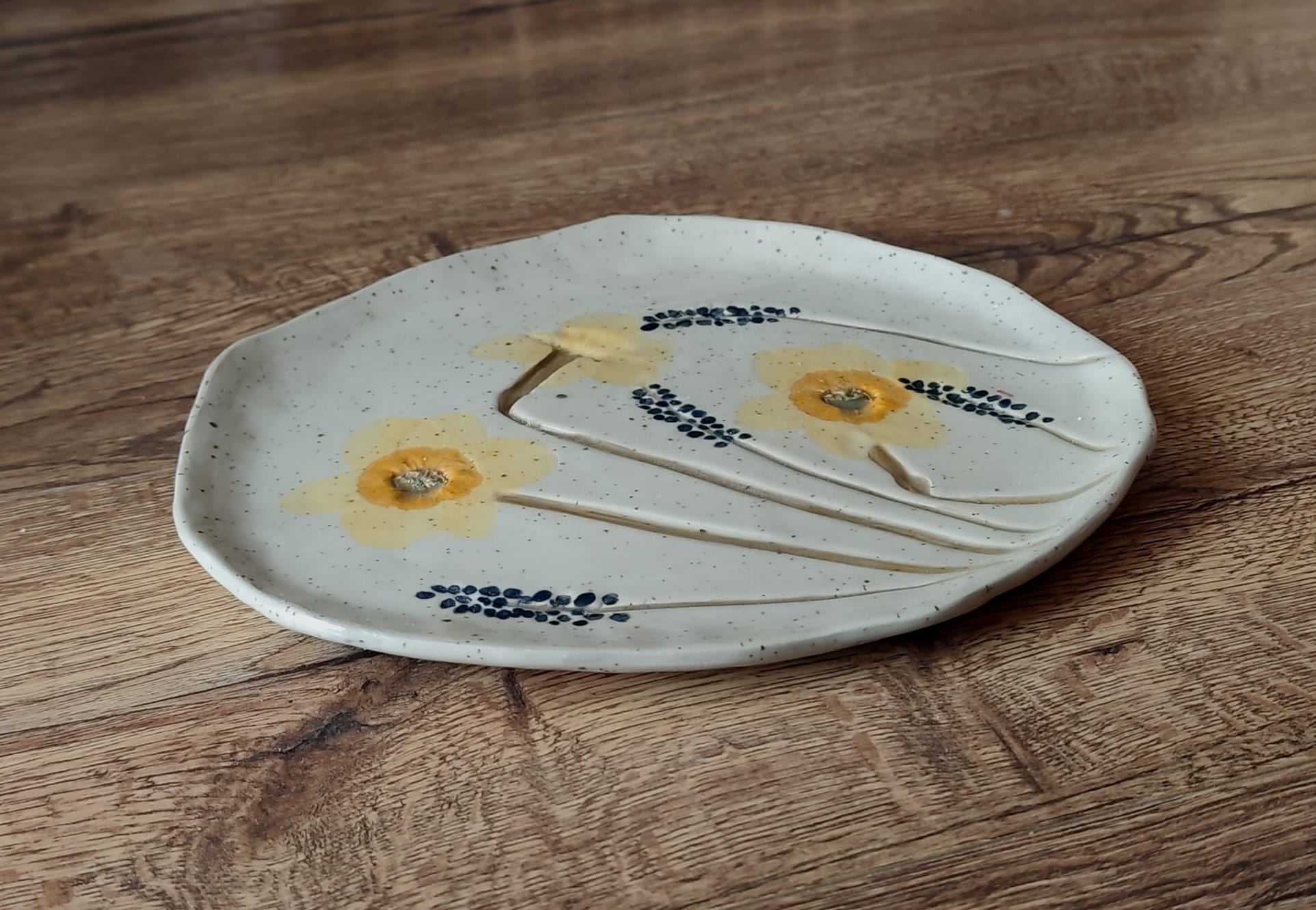 Ręcznie wykonana patera ceramiczna inspirowana naturą – nieregularny kształt o wymiarach mniej więcej 23x22 cm. Lepiona ręcznie. Dekorowana z wykorzystaniem żywych kwiatów, których faktury wyczuwalne są palcami. Detale malowane ręcznie by jak najbardziej oddać naturalny charakter roślin. Całość pokryta szkliwem bezbarwnym.